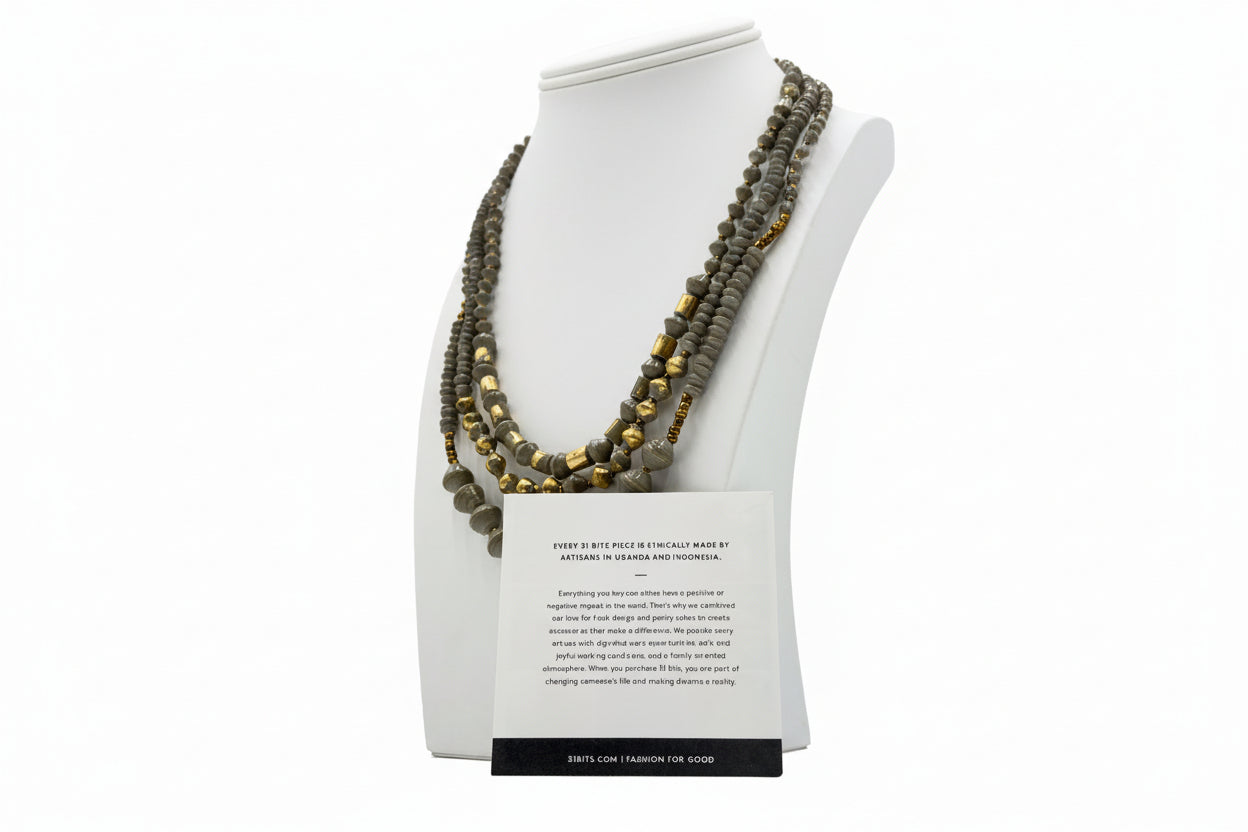 Crafted with three tiered strands of graduated, wrapped paper beads and goldtone glass beads, this Mystic multi-layered necklace from 31 bits is a positively enchanting wardrobe accent. From 31 Bits.
