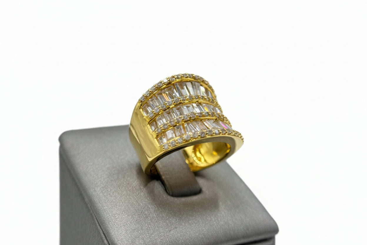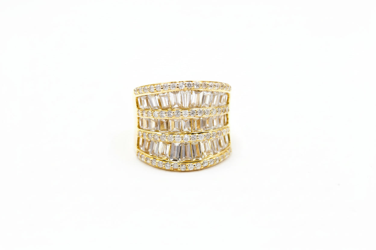Make a bold and sophisticated statement with the Absolute Sterling Silver Goldclad CZ Baguette & Round Multi-Row Saddle Ring. With its striking design, luxurious finish, and sparkling CZ stones, this ring will quickly become a cherished part of your collection. Perfect for those who appreciate the finer details of elegant jewelry.