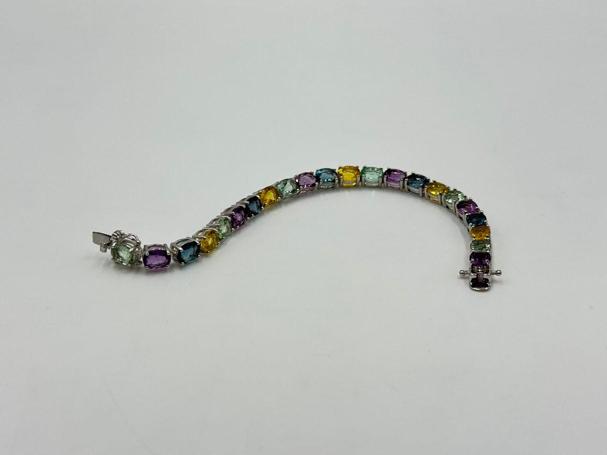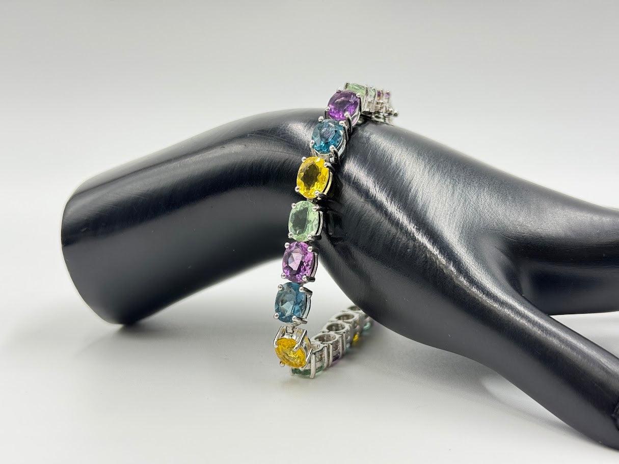 Vibrant color meets timeless elegance in this Absolute Sterling Silver Multicolor Gemstone Tennis Bracelet. Featuring a continuous line of beautifully faceted multicolor gemstones, this classic tennis bracelet delivers eye-catching sparkle and playful sophistication. Crafted in polished sterling silver, the 7" length offers a comfortable, tailored fit—perfect for wearing alone as a statement or layering with your favorite bracelets.