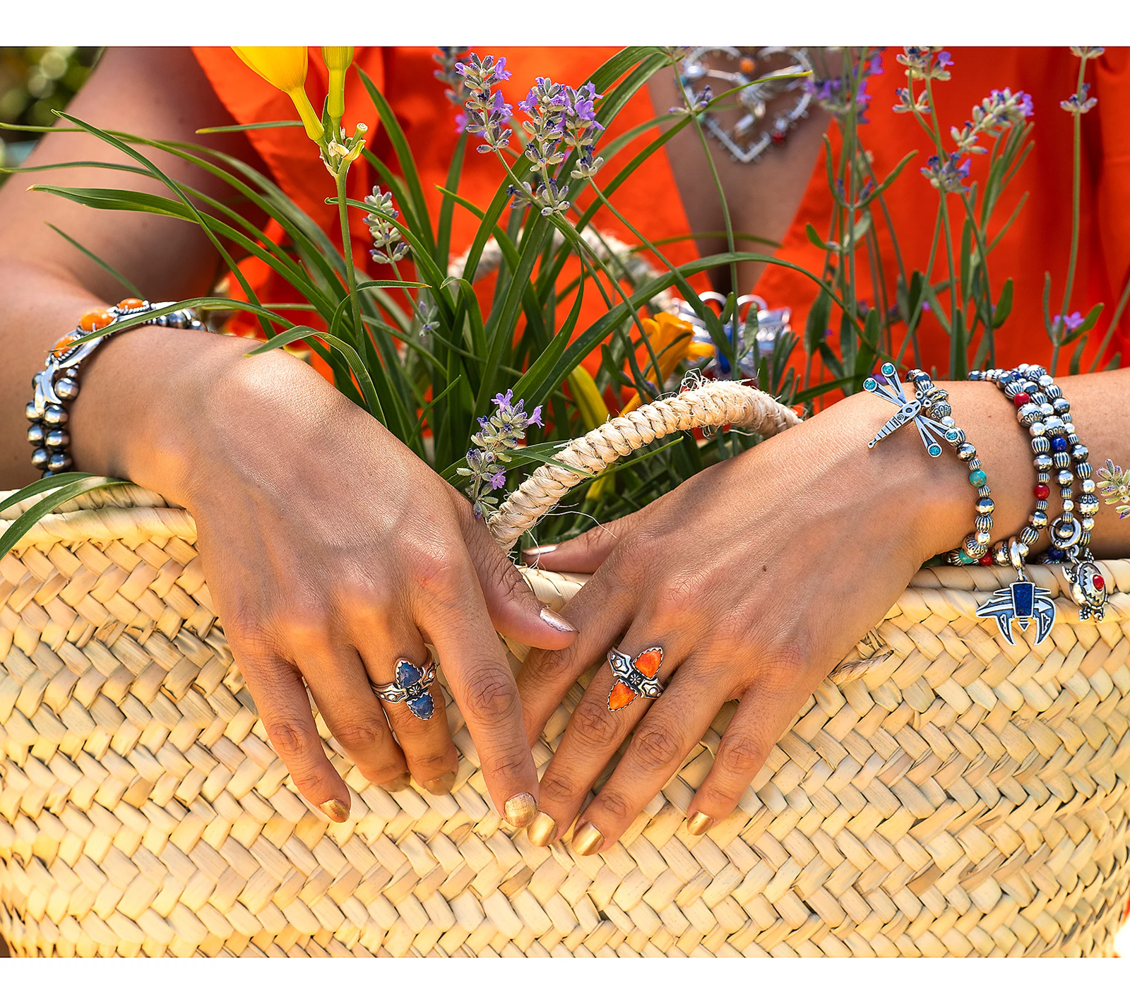 Protect your finger with this shield-shaped ring, resplendent with bold and bright cabochons in a north/south setting. From American West Jewelry.