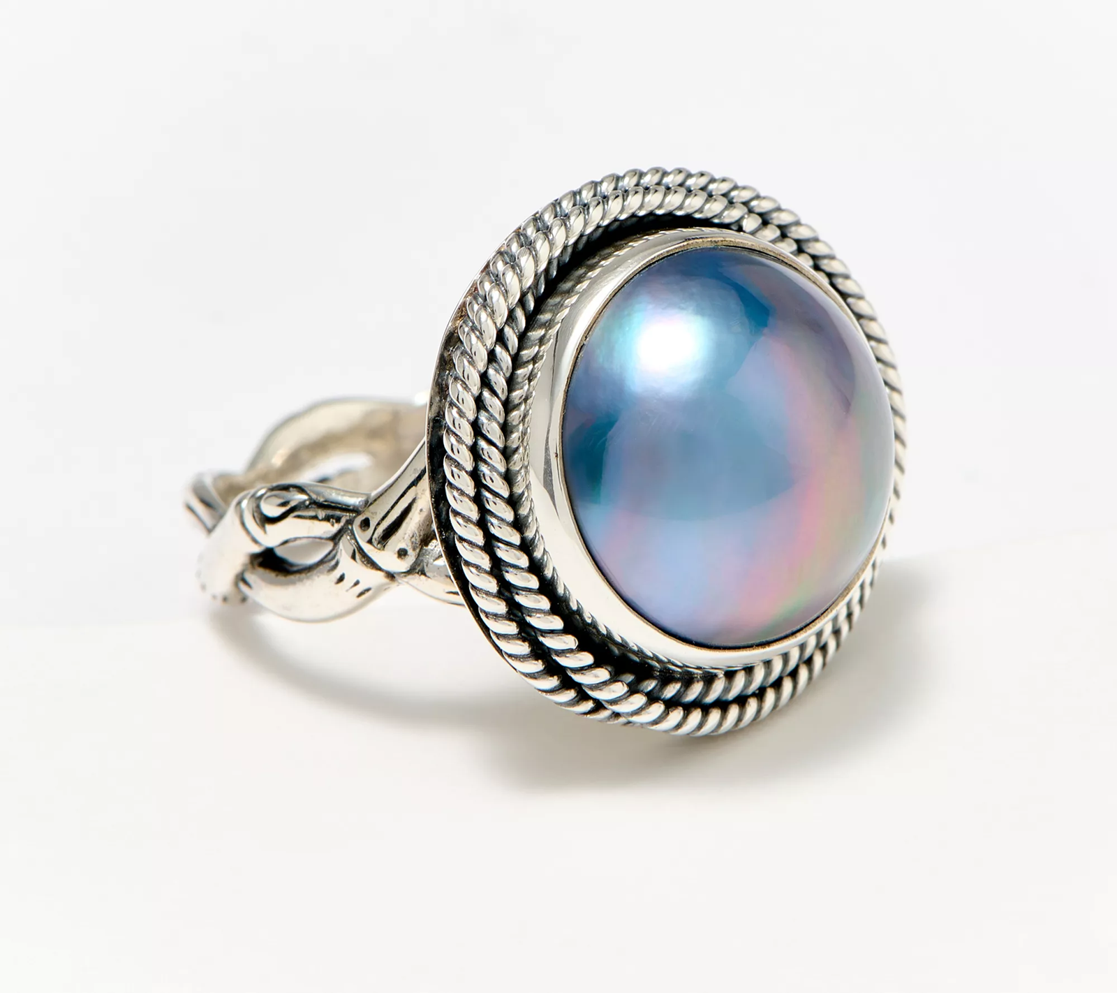 Twisted rope details provide a fabulous frame for the mesmerizing mabe cultured pearl at the center of this unforgettable ring.