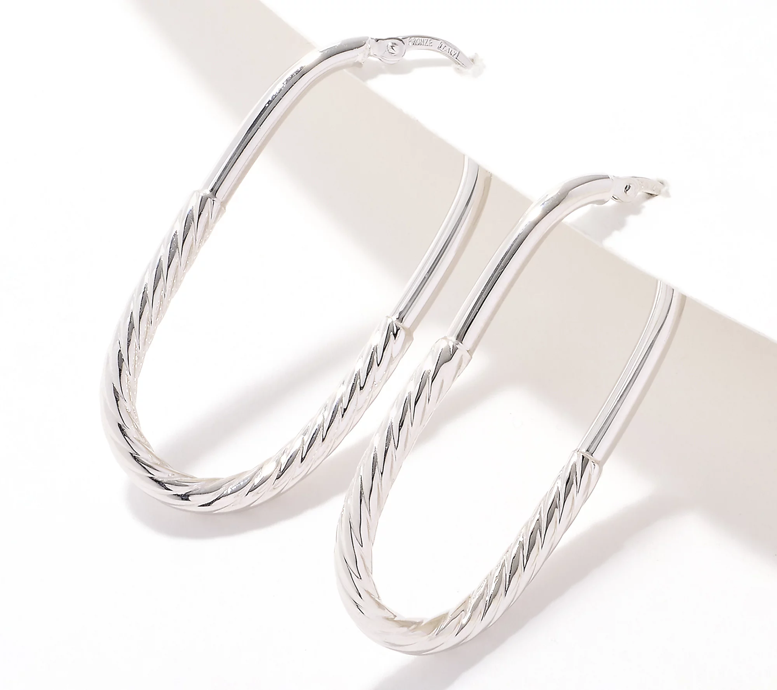 Ready for their style debut, these double texture oval hoop earrings combine a polished finish top with a twist design bottom. From David Markstein.
