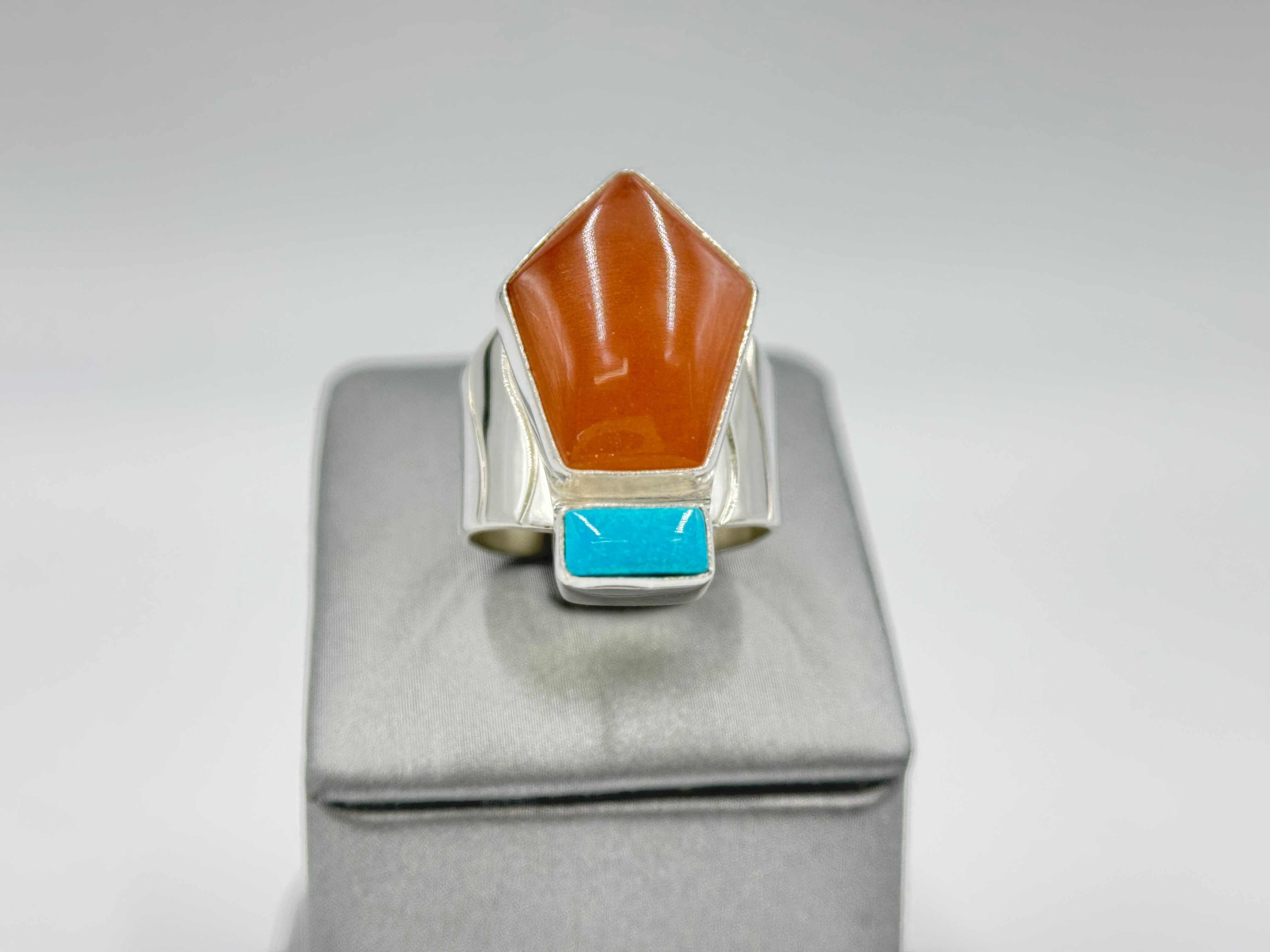 Bold geometry and rich color define this striking Jay King sterling silver statement ring, showcasing a dramatic freeform sunstone cabochon paired with a vivid turquoise accent. The warm coppery glow of the sunstone contrasts beautifully with the cool blue turquoise, creating a powerful, balanced design.