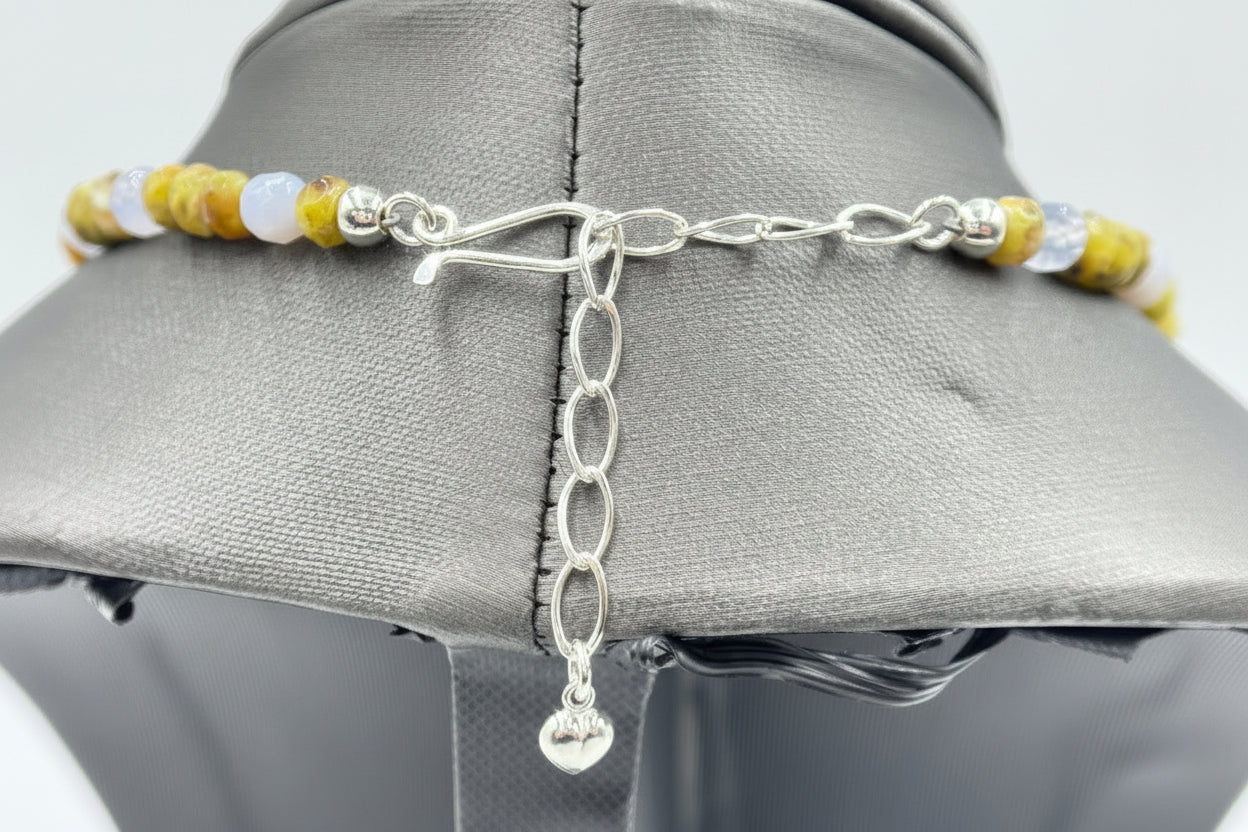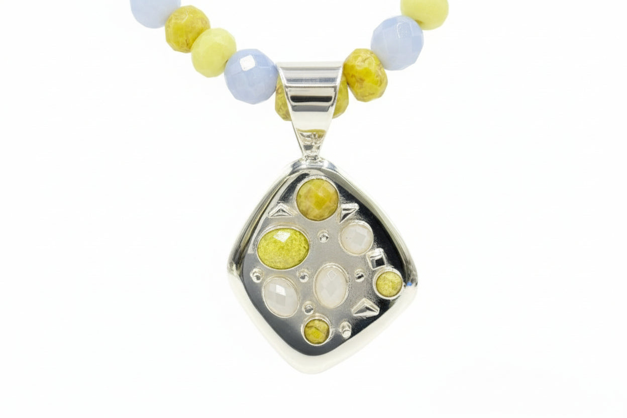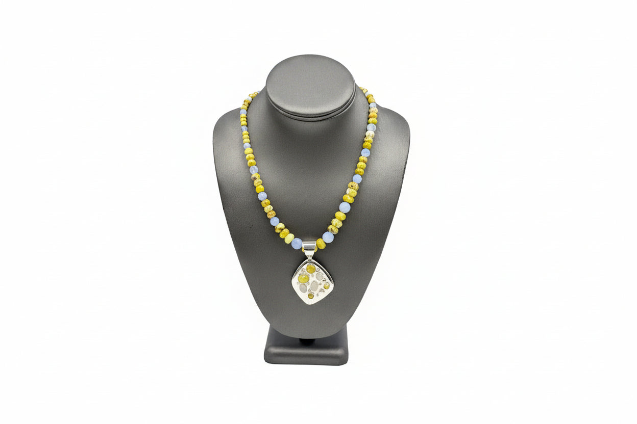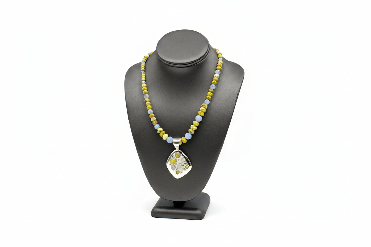 The necklace showcases a beaded strand accented with silver bead details, leading to a geometric pendant that highlights the natural color contrast between soft green and pale blue tones. With its thoughtful stone placement and handcrafted feel, this necklace is a standout addition to any gemstone collection.