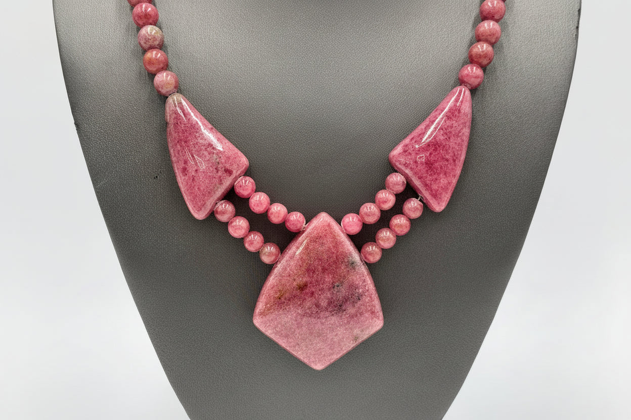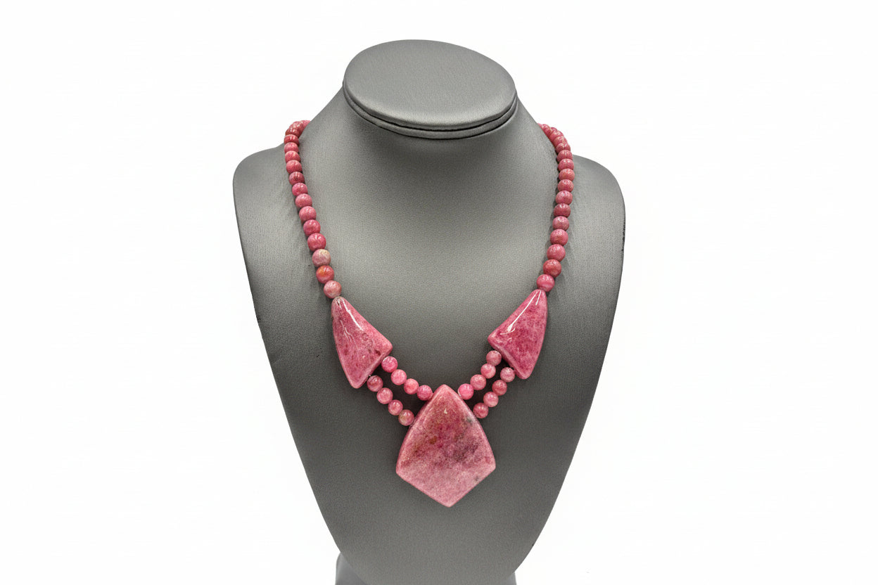 Make a beautiful style statement with this bold, handcrafted necklace design featuring the rich, pink shades of Baroque Rose rhodonite. From Jay King.