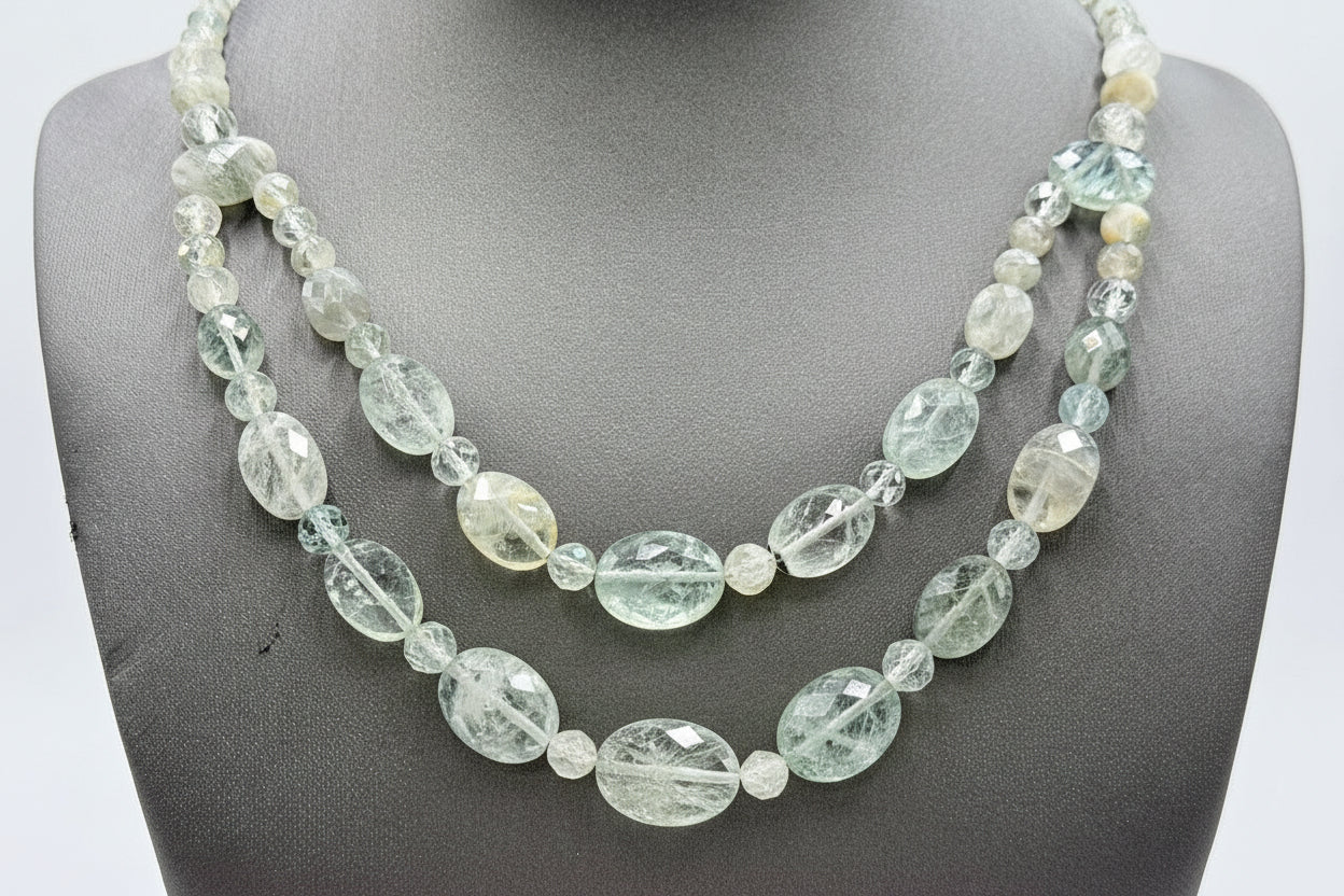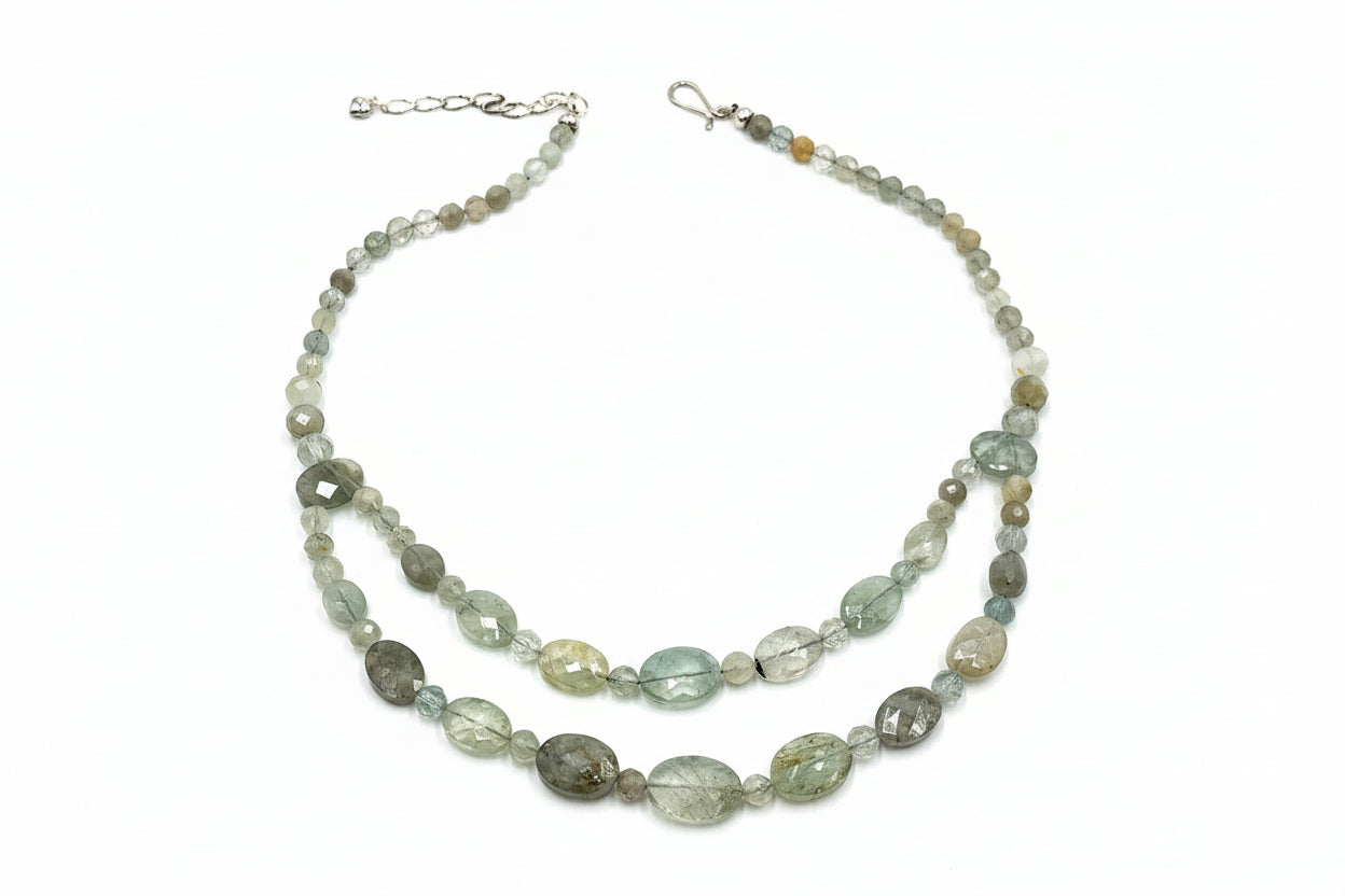 Named for its cool, transparent green tones and icy clarity, this unique labradorite variety shimmers with soft flashes of light, creating a refreshing glow that enhances any outfit. The two-strand drape design features a graceful mix of faceted round and oval stones, each hand-cut to reflect brilliance with every movement.