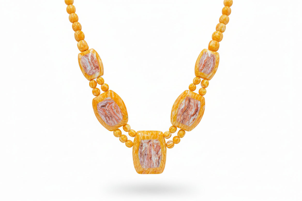Handcrafted from compressed spiny oyster shell, this piece combines the fiery energy of sunset orange and coral red tones with a gleaming .925 sterling silver hook clasp. The design features five barrel-shaped gemstone stations connected by dual strands of nugget-style shell beads, creating a layered look that’s both earthy and luxurious.
