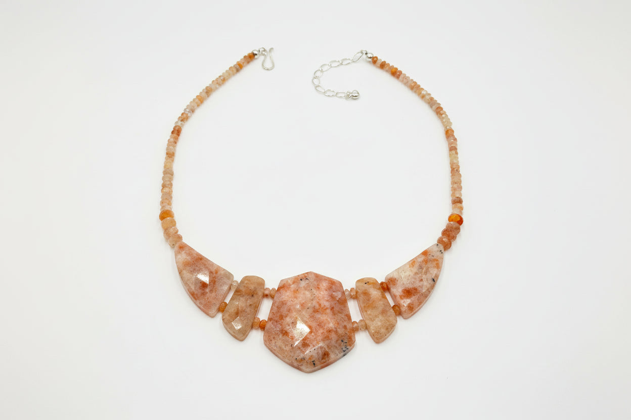 The bold, geometric gemstone stations are accented with smooth, faceted rondelle beads, giving this piece both structure and softness. Its unique hexagonal centerpiece radiates natural color variations — ensuring that no two necklaces are ever alike.