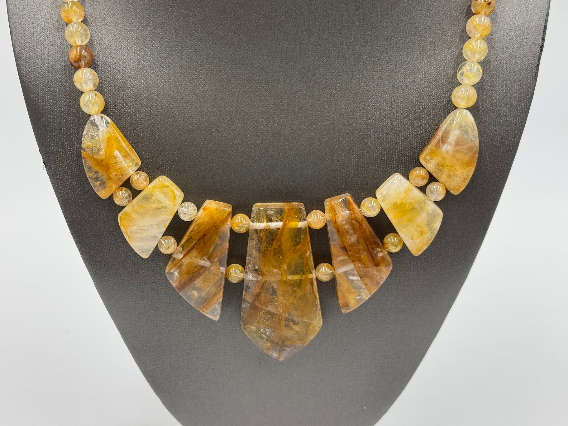 The multicolor yellow quartz stones display a mesmerizing blend of yellow, white, and brown tones—each stone uniquely patterned by nature, ensuring that no two necklaces are ever alike. The large, round center stone anchors the design, flanked by four freeform stations and complemented by smooth, round yellow quartz beads that complete the drape.