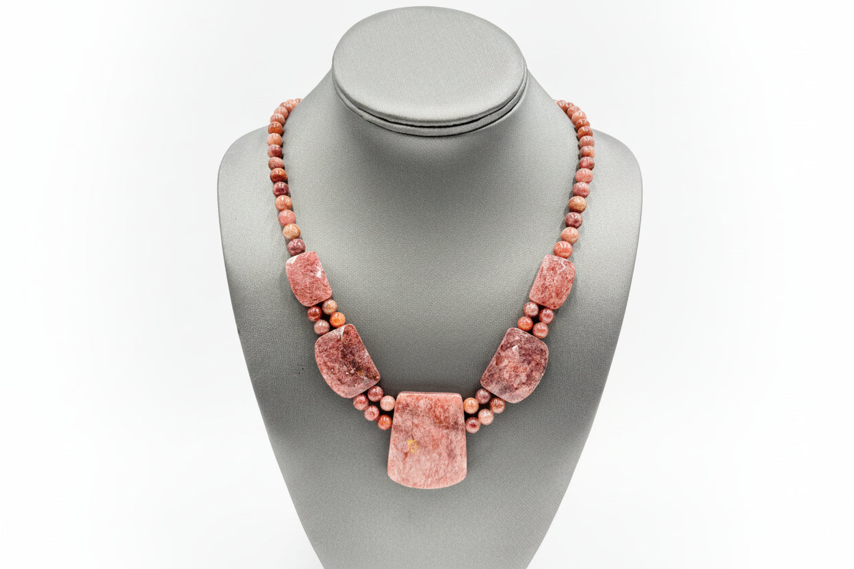 Featuring freeform pink quartzite stones with mottled strawberry-like tones, this necklace captures the warmth and energy of natural gemstones. The five large freeform stations are balanced by polished round beads, all strung by hand to highlight their organic texture and beautiful color variations.
