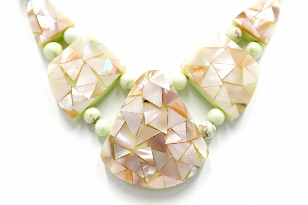 Design: Reversible gemstone drape – Yellow Meadow Stone on one side, Bluefer Shell inlay on the reverse