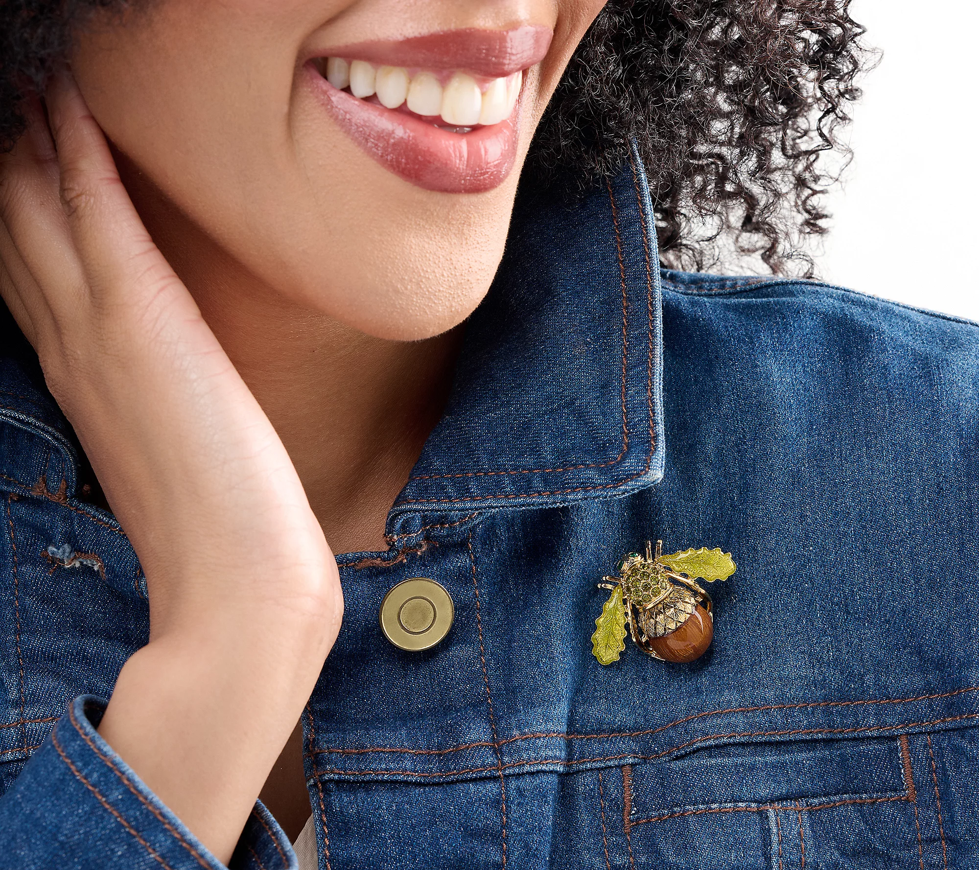 Add instant charm (and subtle symbolism) to any fall outfit with this buzz-worthy acorn bee pin designed with accented with transparent brown and green epoxy and olive green crystals. From the Joan Rivers Classics Collection®.
