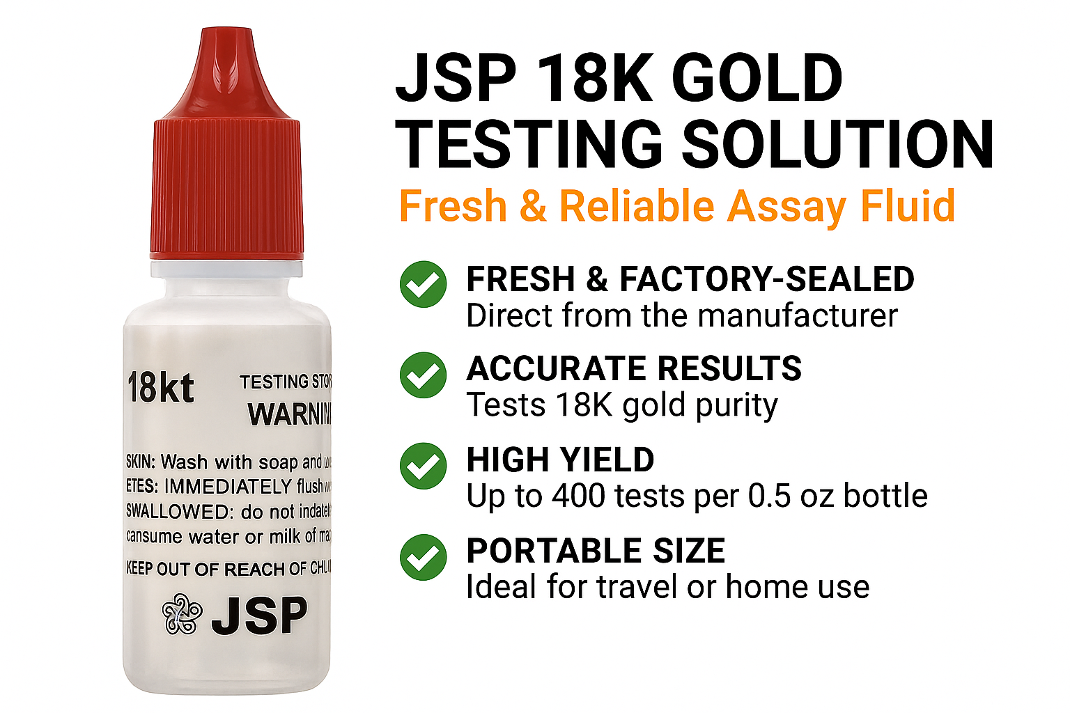 Ensure your gold is the real deal with JSP’s 18K Gold Testing Solution. Manufactured in the USA and widely trusted since 1980, this professional-grade acid provides reliable and precise results when identifying 18K gold purity. Whether you're verifying estate pieces or checking new inventory, JSP delivers peace of mind with every test.