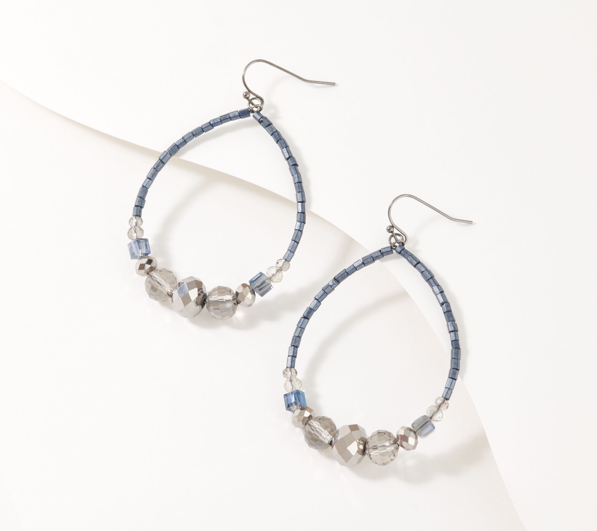 • Front-facing hoops with seed beads and multi-shaped faceted beads