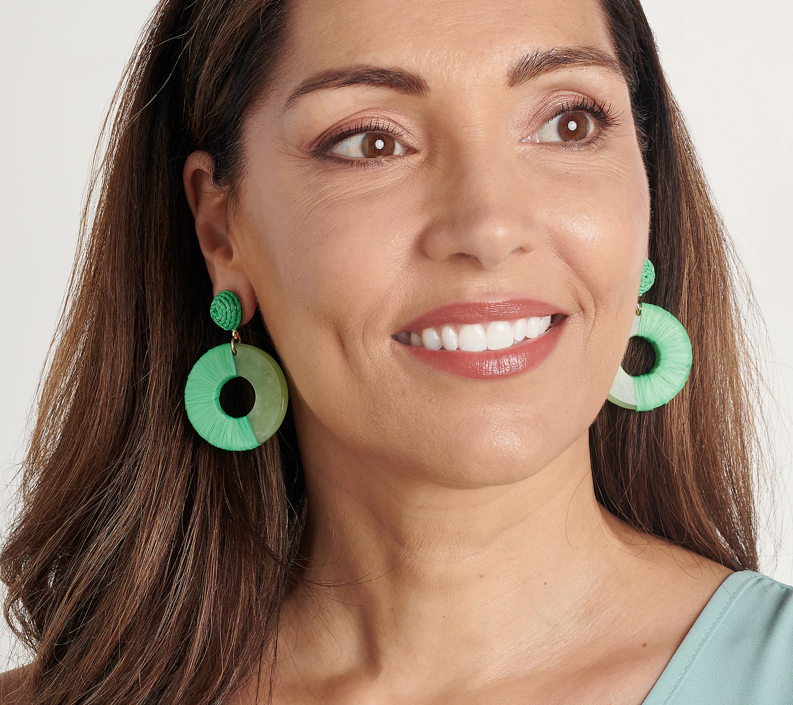 Bringing boho-chic vibes to any outfit, these delightfully dramatic earrings pair a raffia-wrapped post with circle resin drops accented with colorful thread. From True Lovelies.